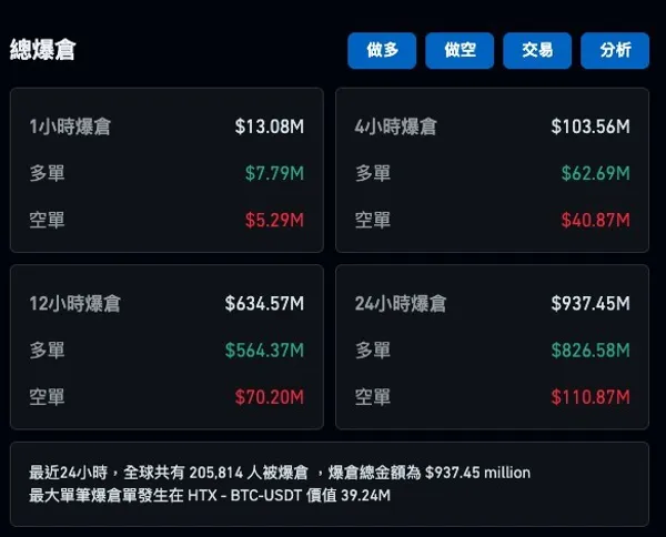 這波急跌導致衍生品市場損失慘重。CoinGlass 數據顯示,最近 24 小時加密貨幣市場爆倉金額高達 9.37 億美元,超過 20 萬名交易者被爆倉,其中絕大多數是押注上漲的多頭部位。