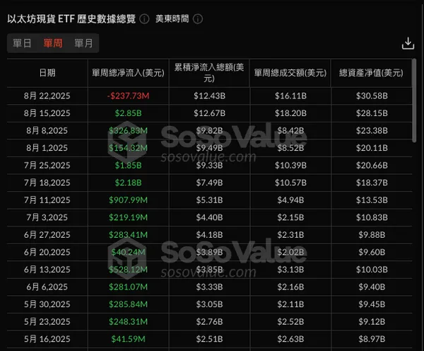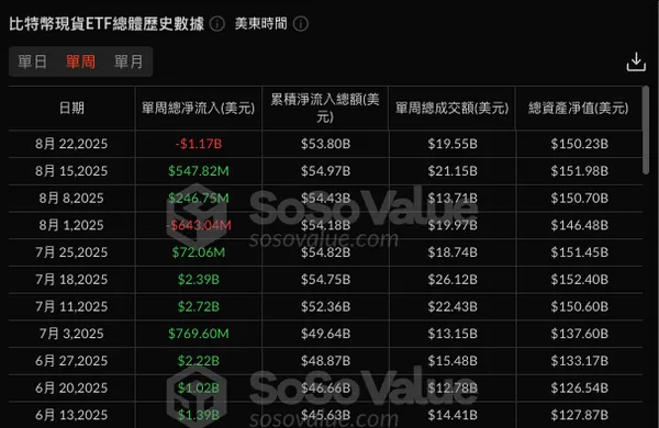 機構資金的退潮更加劇了賣壓。SoSoValue 數據顯示,上週比特幣現貨 ETF 淨流出高達 11.7 億美元,已連續六日淨流出;而以太幣現貨 ETF 也終止了連續 14 週的淨流入紀錄,上週流出 2.37 億美元。