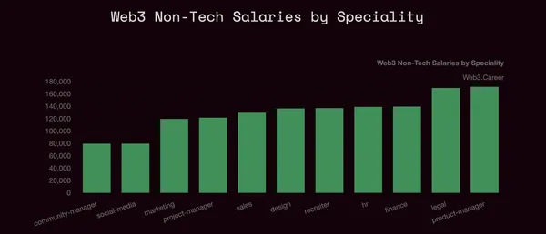 根據 web3.career 的統計,在非技術職位中, 產品經理薪水最高,其次是法務、財務、人資、設計、業務、專案經理、行銷、社群媒體營運、社群經理……