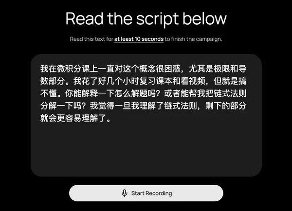 選擇想要輸入的語種後即可進入到素材閱讀介面,點擊「Start Recording」後即可開始閱讀,進行至少 10 秒的錄製後即可點擊「Submitting」提交獲取 10 積分。