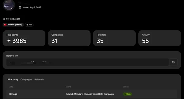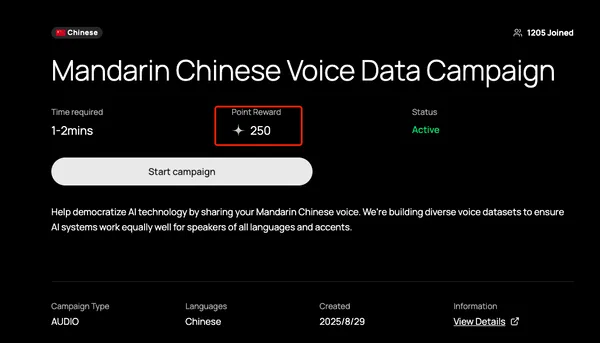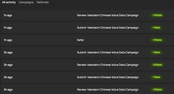根據當前 Poseidon 官方網站內各語種積分獎勵顯示,參與人數最多的英語獲得的積分是最少的,為 10(提交獲得)+50(審核通過獲得),其他語種包括中文皆為 10+250 積分。因此對於中文區的使用者來說選擇中文語音輸入既簡單又可以獲取更高積分獎勵。