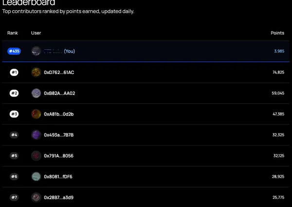 左側選單欄「Leader board」介面可以查看積分排行榜,可以看出目前參與人數並不多,筆者兩天互動總共獲得 3,985 積分在排行榜上位列 435 名,後續隨著參與使用者的增加可能會越來越競爭。