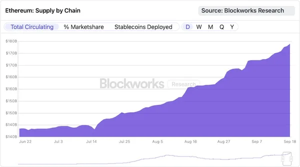根據Blockworks Research數據,目前以太坊仍是穩定幣的主要承載鏈,佔據約60.7%的市佔率,其中$USDT供應量約為840億美元,$USDC約為470億美元。新興穩定幣如$USDe與$USDf亦呈現快速成長,分別新增供應逾1.41億與3,800萬美元,顯示市場競爭加劇。