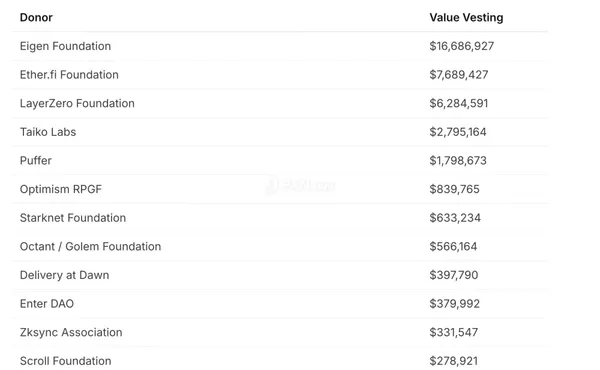 截至目前,EigenLayer、Ether.fi、Taiko、Puffer等以太坊生態項目已承諾將代幣的1%注入Protocol Guild。此外,知名資產管理機構 VanEck 也宣佈將其以太坊ETF收益的10% 捐贈給了Protocol Guild 。