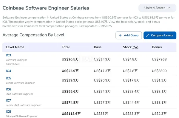 此外,如Avalanche、Polkadot等知名區塊鏈的開發人員薪資也普遍高於以太坊,且常附帶可觀的代幣或股權激勵。而像Coinbase這樣的主流交易所,其美國軟體工程師的年薪中位數為40萬美元,就連入門級軟體工程師的基礎薪也有14.9萬美元,另有股票和獎金共約5.6萬美元。