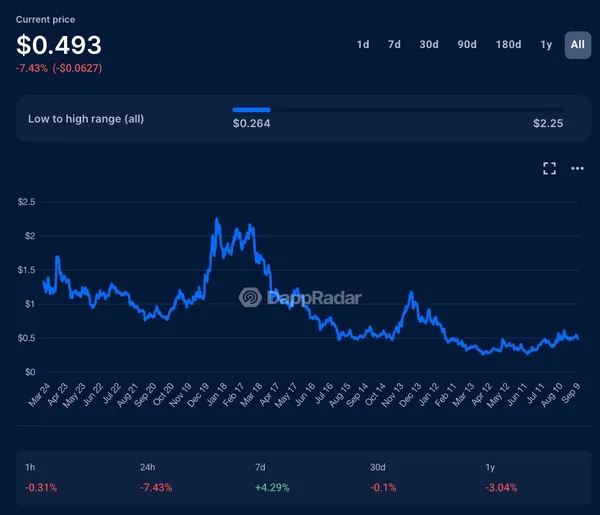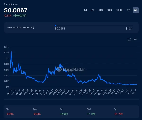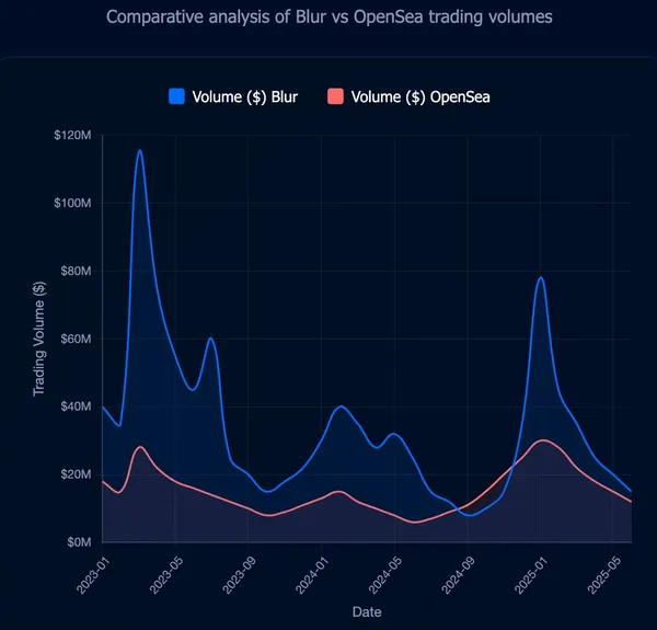 BLUR代幣本身遵循了熟悉的軌跡。它首次亮相時約為$1.20,但隨著領取者拋售而迅速下跌,到2025年已跌至$0.10以下。即使持續的獎勵季度也未能阻止價值的逐漸侵蝕。到2023年底,Blur的市佔率也開始下降,在初始激增後穩定在20%至40%的範圍內。