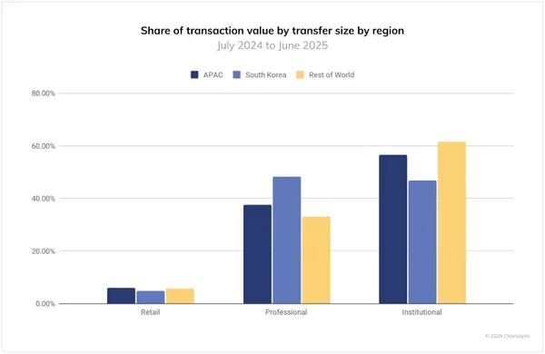 回到鏈上交易量的話題,韓國加密市場在價值1萬至100萬美元的交易規模中活動量巨大,此處將其定義為「專業」交易活動。韓國近一半的鏈上交易活動都來自這一範疇,遠高於全球水準。這反映出在發達經濟體中用戶活躍交易的文化。儘管迄今為止監管規定限制了企業和機構參與者進入韓國市場,但近期監管措施的加強正逐漸為企業的參與打開大門,這有可能為市場增添多樣性。