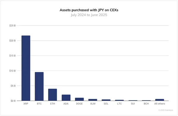 日本的增長緊隨其加密行業取得的重大進展。一段時間以來,監管限制阻礙了穩定幣在日本交易所的上市,不過這種情況正在改變。在截至2025年6月的12個月裡,使用日元購買的加密貨幣主要流向了XRP,其法幣交易額達217億美元,其次是比特幣(96億美元)和以太坊(40億美元)。其中,XRP的交易量占據主導地位,這表明投資者可能在押注XRP在現實世界中的實用性,這得益於Ripple公司與SBI的戰略合作。展望未來,市場將密切關注諸如USDC和JPYC等穩定幣的市場接受度。
