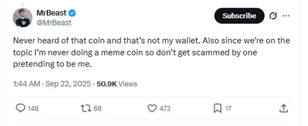 直到2025年9月份,隨著MrBeast的錢包地址再次買進市場熱門的ASTER代幣,截至10月1日,MrBeast共花費168萬美元買了95萬枚ASTER。此舉再次引發了社群關於他即將「喊單」的猜測。但這一次,MrBeast的反應出乎所有人的意料。面對社群的討論,他公開發表聲明,直接否認了這筆投資,稱他「從未聽說過這個幣」,並且「那不是他的錢包」。