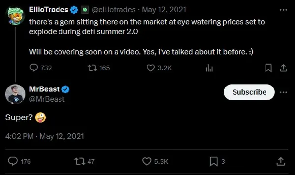 在代幣公開發行後,MrBeast開始利用其巨大的社群媒體影響力進行「推廣」。2021年5月12日,在項目創始人發布了一條關於市場機遇的推文後,MrBeast在下方回覆了一個詞:「super?」。這條看似不經意的互動,對於他數千萬的粉絲來說,無異於一個強烈的看漲訊號。