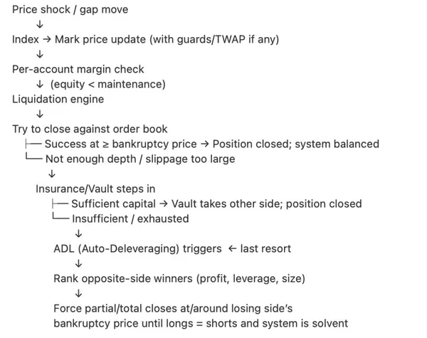 交易所通常會根據盈利、杠桿率和規模對倉位進行排序,盈利最多的倉位會首先被平倉。大多數主要的交易平台(幣安、Bybit、BitMEX、Aevo)都采用類似的自動減倉(ADL)排名系統,通常在清算倉位的破產價格執行。被迫退出盈利交易的感覺非常不公平,但另一種選擇是系統破產。你可以在賭場里主宰每張牌桌,但最終你會遇到沒有籌碼的對手。這就是ADL時刻:當你觸及模擬的邊界,意識到這個漂亮的現貨市場覆制品最終只是一個有界限的現金轉移遊戲。