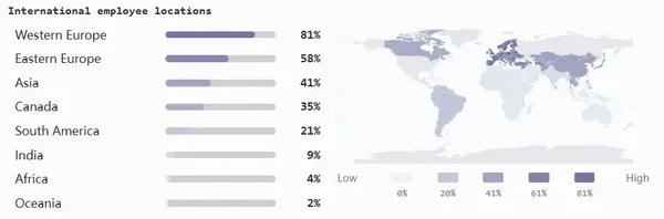 全球優先是默認模式,大多數團隊從第一天起就跨國招聘。普遍而言,人才獲取和靈活性比地理位置更重要。
