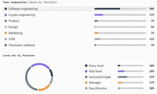 - 工程(軟件和加密)崗位約占總員工數的67%,涵蓋不同規模、階段和融資輪次的企業