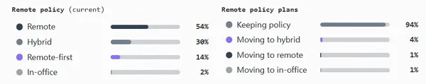- 超過一半的公司完全遠程辦公,超過四分之一的公司採用混合模式,而遠程優先的公司占比較小,為14%。