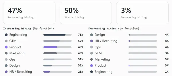 - 工程部門引領增長,約78%的團隊在擴張,僅有1%的團隊在裁員。這也是唯一一個有真正初級職位招聘渠道的部門。