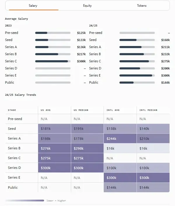 按發展階段劃分,預期的模式依然成立:早期公司提供的薪資較低,但股權更多(通常是兩倍),而後期團隊則相反。代幣總體上變得不那麼常見,但在市場推廣(GTM)、產品和高級國際職位中仍具有重要意義。