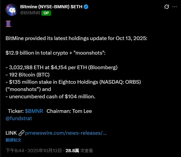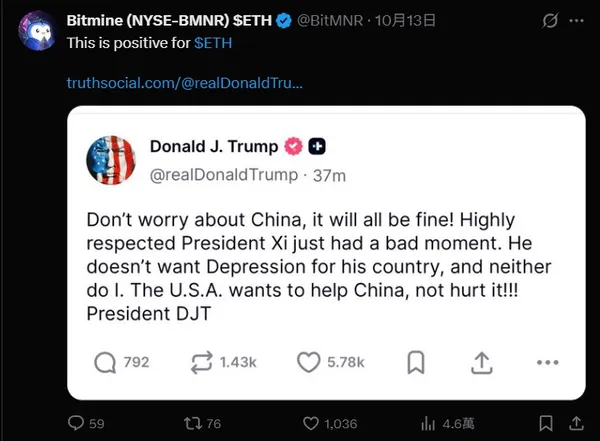 BitMine的官方X帳號也分享此文,並評論這對以太幣是正面消息。