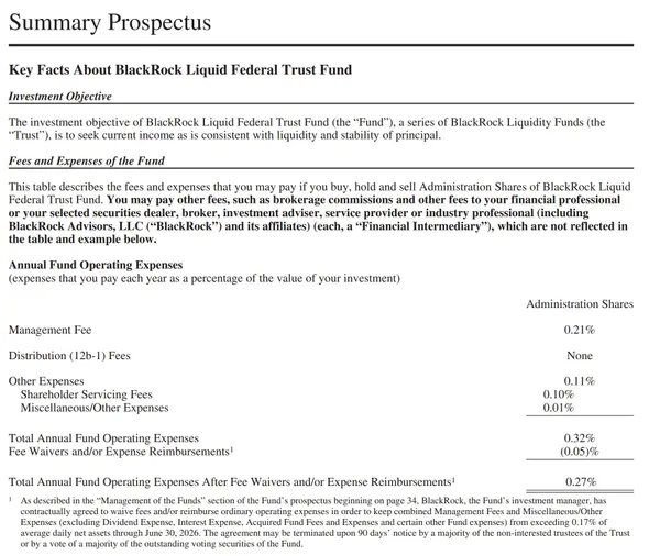貝萊德此舉明顯是在為新監管環境提前佈局。該基金原名為「BlackRock Liquid Federal Trust Fund」,現已完成結構重組與品牌更新,定位為專屬於機構投資人(尤其是穩定幣發行方)的超低風險儲備池。依據申報文件和招股說明書,基金管理費為0.21%,加上股東服務費後總支出為0.27%,並已簽訂至2026年的費用減免協議。
