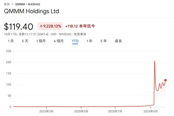 QMMM在今年9月9日宣布將建立價值1億美元的數位資產儲備,投資標的包含比特幣、以太幣和Solana。消息傳出後,QMMM股價一度飆升超過2300%,三週內累計漲幅達959%,引發市場轟動。