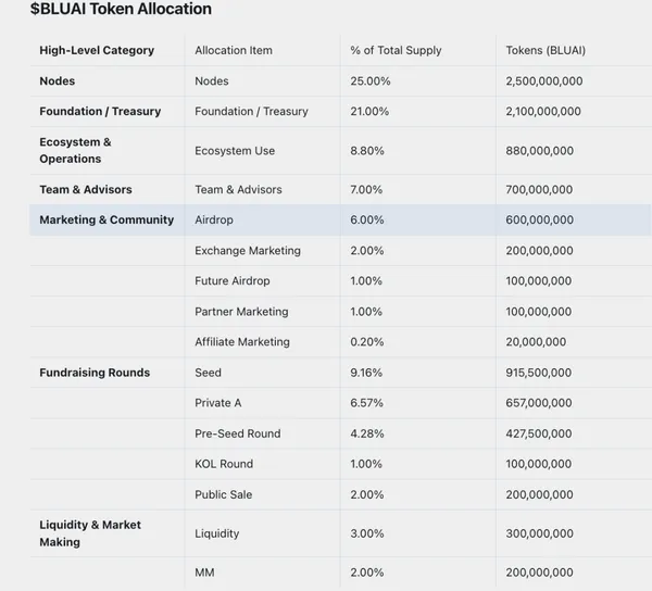 在Web3世界,一個專案的經濟模型是其生命力的核心。其生態代幣BLUAI的總供應量固定為100億枚,在TGE(代幣生成事件)時,初始流通量為12.28億枚,占總量的12.28%。