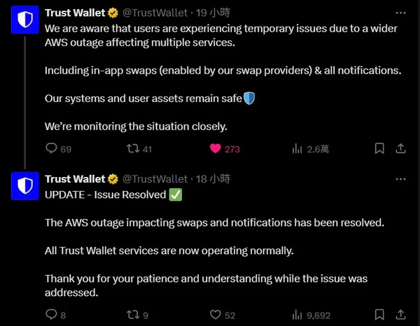 部分知名加密貨幣平台昨天都受到衝擊,包括交易所Coinbase和券商Robinhood都證實服務受到影響,而加密錢包商Trust Wallet也曾表示,APP裡的兌換與通知功能暫時中斷,目前問題都已經修復。
