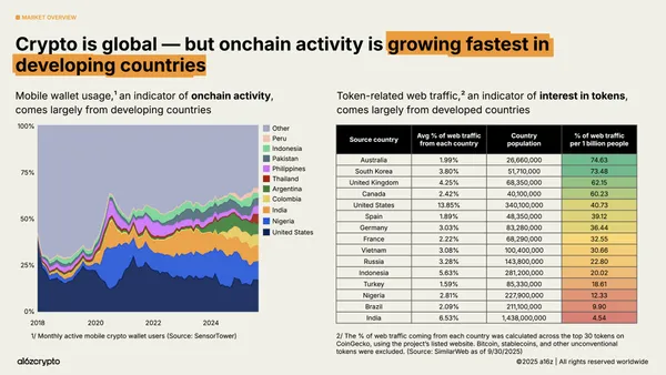 加密貨幣應用具有全球性,但不同地區的使用場景存在顯著差異。移動錢包的使用率(鏈上活動的指標)在阿根廷、哥倫比亞、印度和奈及利亞等新興市場增長最快。尤其是在阿根廷,由於貨幣危機不斷升級,過去三年里,加密移動錢包的使用率增長了16倍。