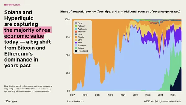 隨著區塊鏈持續擴容、手續費市場成熟及新應用湧現,實際經濟價值(衡量用戶為使用區塊鏈支付的真實成本)成為更重要的指標。目前,Hyperliquid與Solana貢獻了53%的創收型經濟活動——這與前幾年比特幣與以太坊主導市場的格局形成顯著差異。