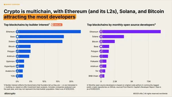 在開發者層面,加密貨幣行業仍保持多鏈並存格局。比特幣、以太坊(及其Layer 2網路)、Solana吸引了最多開發者。2025年,以太坊及其Layer 2網路是新開發者首選生態;而Solana則是增長最快的生態之一,過去兩年開發者關注度提升78%。
