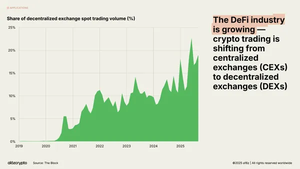 曾經,鏈上經濟只是早期採用者的小眾領域;如今,它已發展為覆蓋多個行業、月活躍用戶數千萬的大型市場。目前,近五分之一的現貨交易量來自去中心化交易所(DEX)。