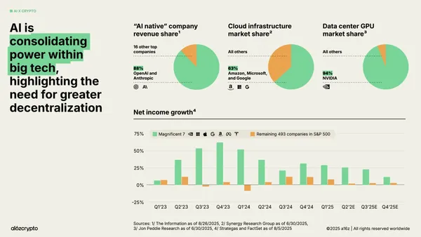 當前,AI的計算層正逐漸向少數科技巨頭集中,引發 「中心化」 與 「審查風險」 擔憂。OpenAI和Anthropic兩家公司控制著「人工智能原生」公司88%的收入。亞馬遜、微軟和Google控制著63%的雲端基礎設施市場,而輝達則佔據了 94% 的數據中心 GPU 市場。這些失衡推動了「七巨頭」在過去幾年中實現了兩位數的季度淨收入增長,而標普其餘493家公司的整體盈利增長卻未能跑贏通脹。