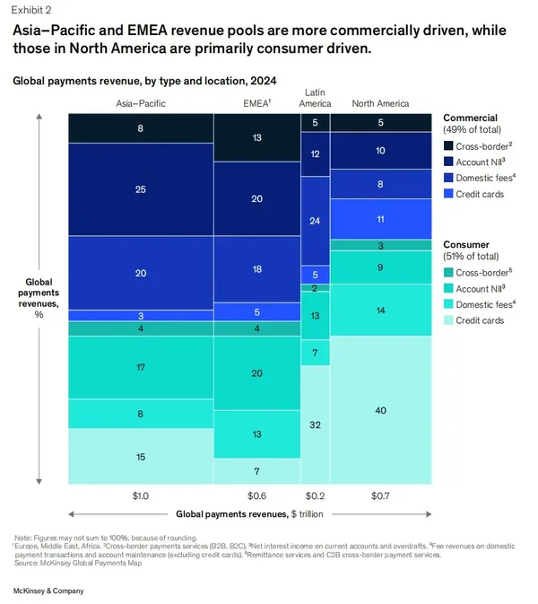 總體來看,全球支付收入在消費者端與商業端幾乎平分,但各地區構成差異顯著。