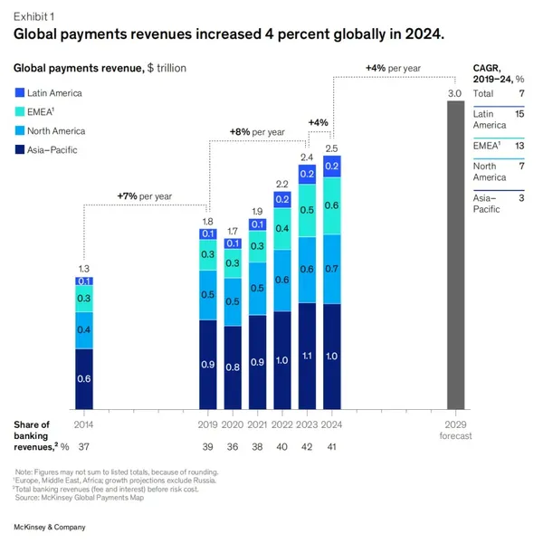 2019年至2024年間,全球支付收入年均增長7%。受利率走高推動,2024年利息收入佔總收入的46%。當年增速降至4%,顯著低於2023年的12%。放緩原因包括:利率見頂、宏觀經濟趨弱、低收益支付方式結構性擴張,以及持續的手續費擠壓。