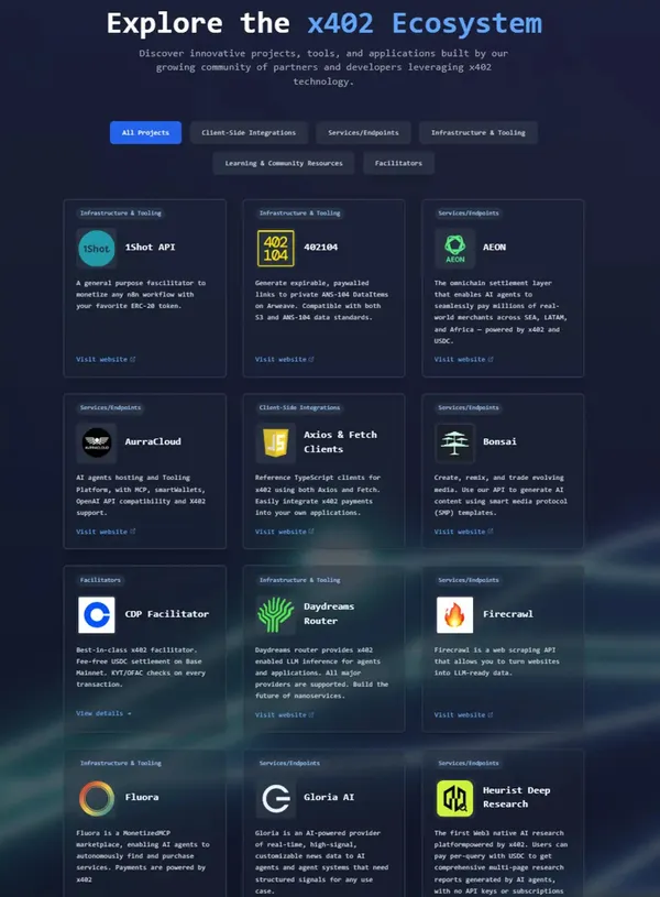 在x402協議官網上的Ecosystem頁面有著當前的專案彙整。如果一個一個專案點進去查看的話,會感覺到這個協議仍然處在一個相當早期的發展階段。點進去直接是技術文件或跳轉到Github的專案也不少。