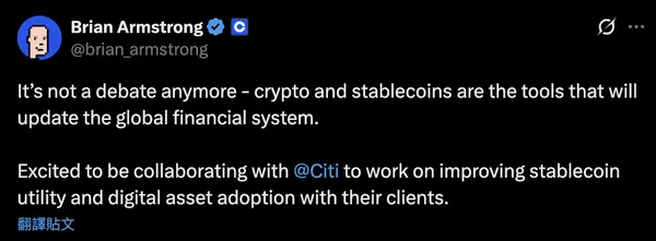 Coinbase執行長Brian Armstrong在X上發文表示:「這已經不再是辯論,加密貨幣與穩定幣將成為升級全球金融系統的工具。與花旗合作,代表華爾街正式擁抱區塊鏈驅動的支付未來。」