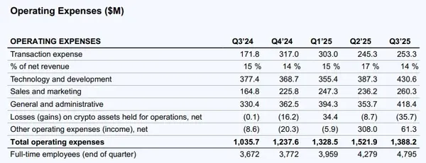 技術與開發支出為4.31億美元,較上季增長11%,主要受員工人數增加的推動, 全職員工人數較上季增長12%,至4795人,其中包括來自Deribit的員工。