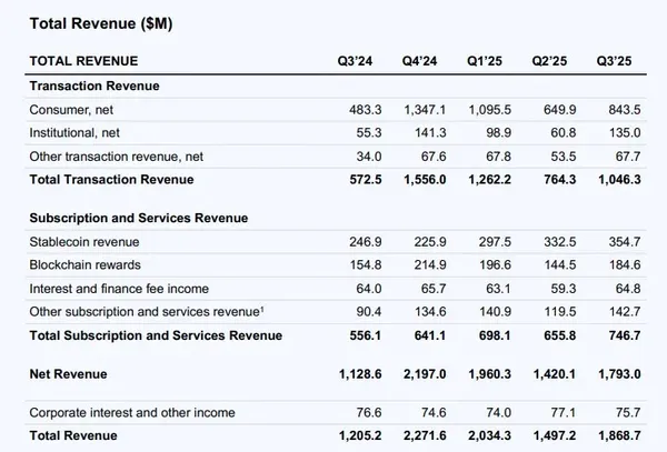收入驅動因素: 增長主要受益於市場交易活躍度提升、加密資產價格反彈,以及訂閱與服務業務(如穩定幣USDC收入達3.55億美元)的持續擴張。