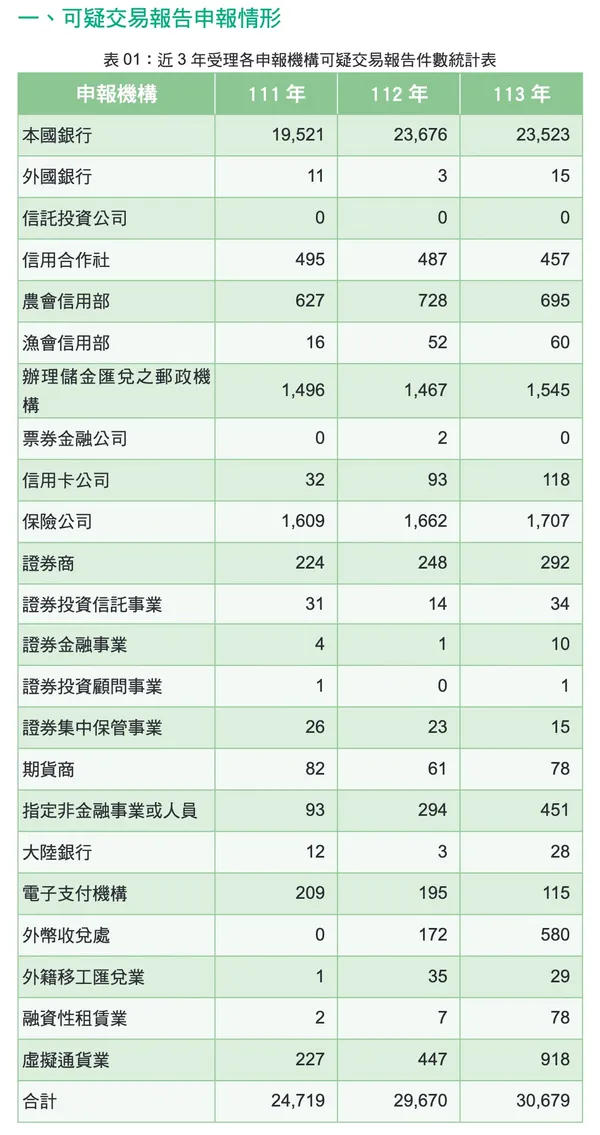 年報指出,113年受理的可疑交易報告總件數達30,679件,連續三年突破3萬大關,其中本國銀行仍為申報主力,但虛擬資產業的增幅最為明顯。 調查局分析,隨著詐欺與加密資產投資活動交錯複雜,洗錢樣態正快速演變,金融機構與監理機關的警覺性明顯提升。 這也反映出加密產業在合規與風險管理上仍有明顯斷層。