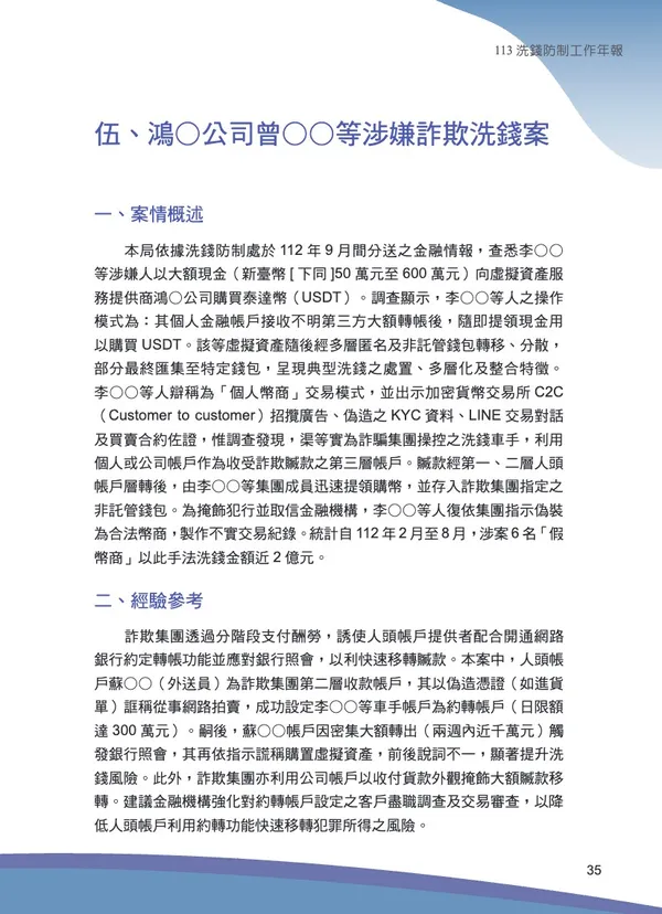 年報中特別揭露「鴻O公司曾○○等涉嫌詐欺洗錢案」引發產業關注。案件指出, 該集團成員利用大額現金(每筆介於50萬至600萬元)向虛擬資產服務提供商鴻O公司購買泰達幣($USDT),再透過多層非託管錢包分散轉移資金。 這些交易雖以「個人幣商」名義操作,卻實為詐欺集團的洗錢車手行為。