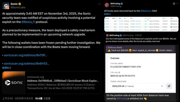 SonicLabs亦凍結了攻擊者在BeetsFinance(Balancer分叉版本)上的錢包,BitFinding與Base MEV機器人則合計追回約75萬美元。