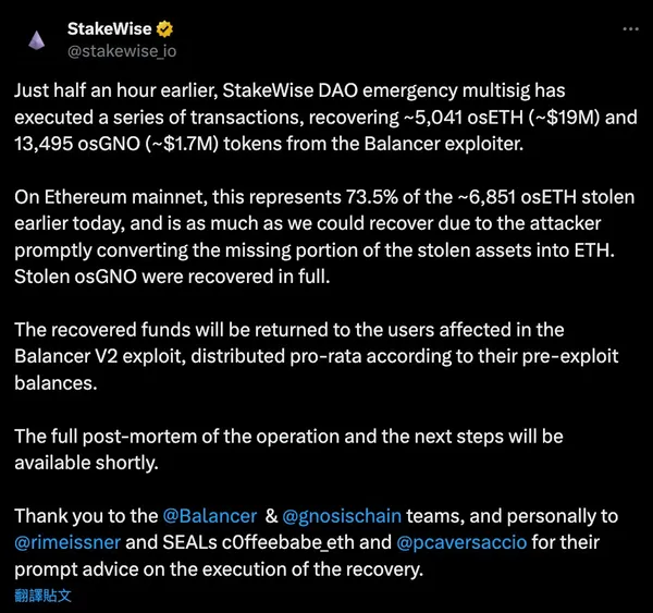 事件發生後,Balancer與多個安全夥伴及白帽團隊迅速啟動應變機制。根據報告,StakeWise成功追回約1,900萬美元等值的$osETH以及200萬美元的$osGNO,回收資產比例高達7成以上。