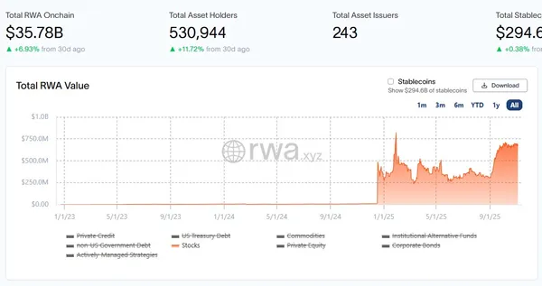 RWA代幣化市場近年吸引金融機構積極佈局,根據RWA.xyz的數據,截至11月6日,全球代幣化市場(不含穩定幣)規模已超過357億美元, 其中以私人信貸、機構另類投資基金與美債的佔比最高,而代幣化股票的規模也來到了6.7億美元,正在快速成長中。