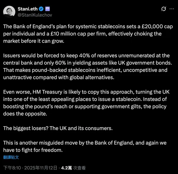 Aave創辦人Stani Kulechov在X直言,這項政策是在「市場成長前就把它勒死」,完全低估穩定幣在跨境支付、金融流動性與Web3應用中的核心角色。 他更指出,以如此高比例配置短期國債,加上嚴格限制使用者能持有的數量,將使英國版穩定幣在全球環境中「毫無競爭力」。