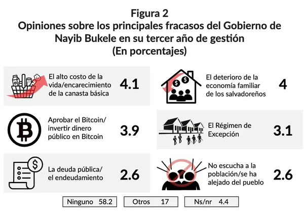 - 七成以上民眾認為政策沒有帶來好處:根據中美洲大學公共輿論研究所(José Simeón Cañas)過去針對薩爾瓦多人民對該國實施比特幣法的看法進行調查,高達71.1%的人認為比特幣沒有給他們帶來任何好處,甚至有3.9%的人認為比特幣是政策失敗的主因,可見信任赤字已逐漸浮現,大多數人民對這場實驗並無明顯獲益感,更多的是將之視為政府的獨角戲。