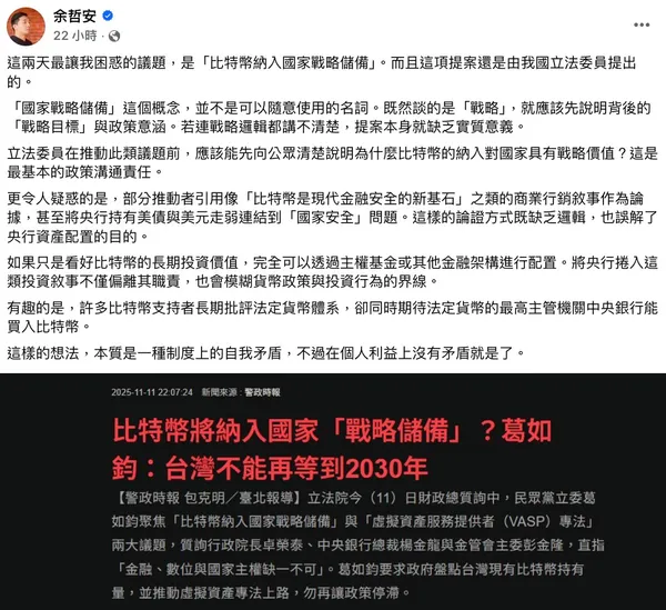 金融研究員余哲安便直言,比特幣的用途與屬性更接近投資性商品,而非國家危機工具。他指出黃金是「貨幣體系崩潰後的開機片」,因為它具備長期被全球央行接受的歷史地位;比特幣則不具備同等的制度支持或市場共識。並批評道:「既然談的是『戰略』,就應該先說明背後的『戰略目標』與政策意涵。若連戰略邏輯都講不清楚,提案本身就缺乏實質意義。」