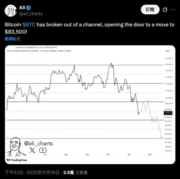 面對暴跌,分析師對後市看法不一。加密貨幣分析師Ali Martinez表示,比特幣已跌破關鍵通道,可能會進一步跌至83,500美元。