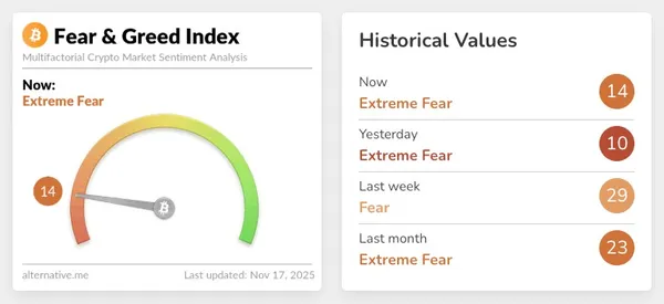 Alternative的數據顯示,加密貨幣恐懼與貪婪指數昨日(11/16)跌至10,目前雖回升至14,但仍處於「極度恐懼」的區域。