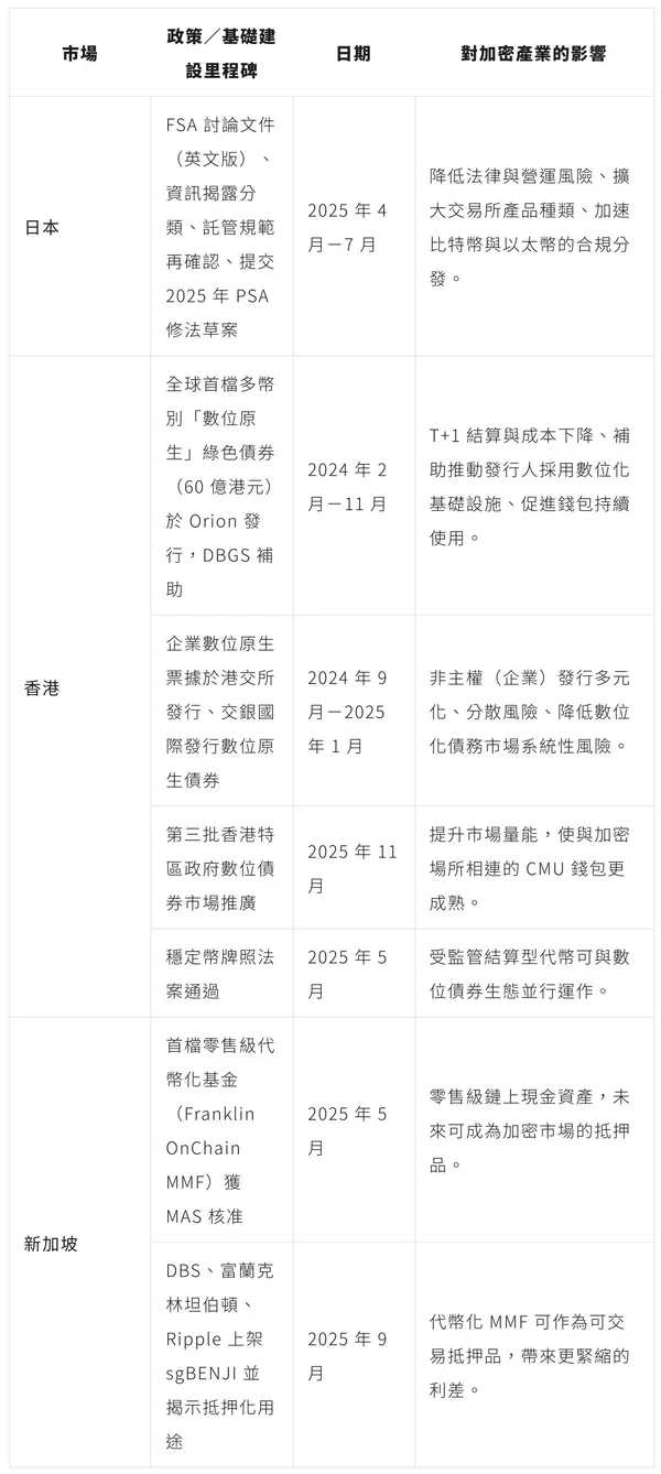 - 監管競逐加速,日本、香港、新加坡三地正在推動託管規範、數位債券、穩定幣牌照與代幣化基金等制度化基礎建設,使區域金融中心重新洗牌。
