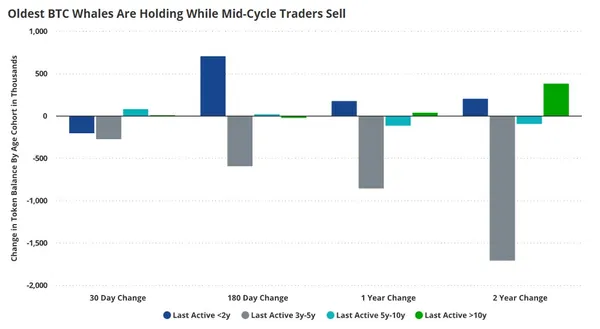 與此同時,持有比特幣超過五年的長期巨鯨群體,仍保持著驚人的韌性。
