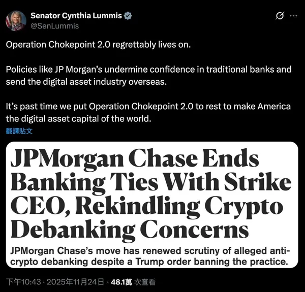 事件曝光後,美國參議員辛西婭・魯米斯(Cynthia Lummis)強烈批評摩根大通的作法,直指這類行為「破壞民眾對傳統銀行的信任,並迫使加密產業外移」。她在X上呼籲應徹底終結Operation Chokepoint 2.0,使美國重新成為數位資產產業的核心。