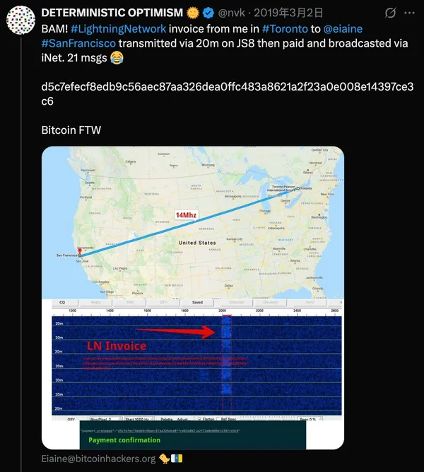 2019年,加密開發者Rodolfo Novak從加拿大多倫多,透過業餘無線電設備、40公尺波段與電離層反射,把一筆比特幣交易傳送到位於美國舊金山的《彭博》專欄作家Elaine Ou手上,全程沒有使用網路、沒有衛星,只靠自然界的電波完成跨境傳輸。